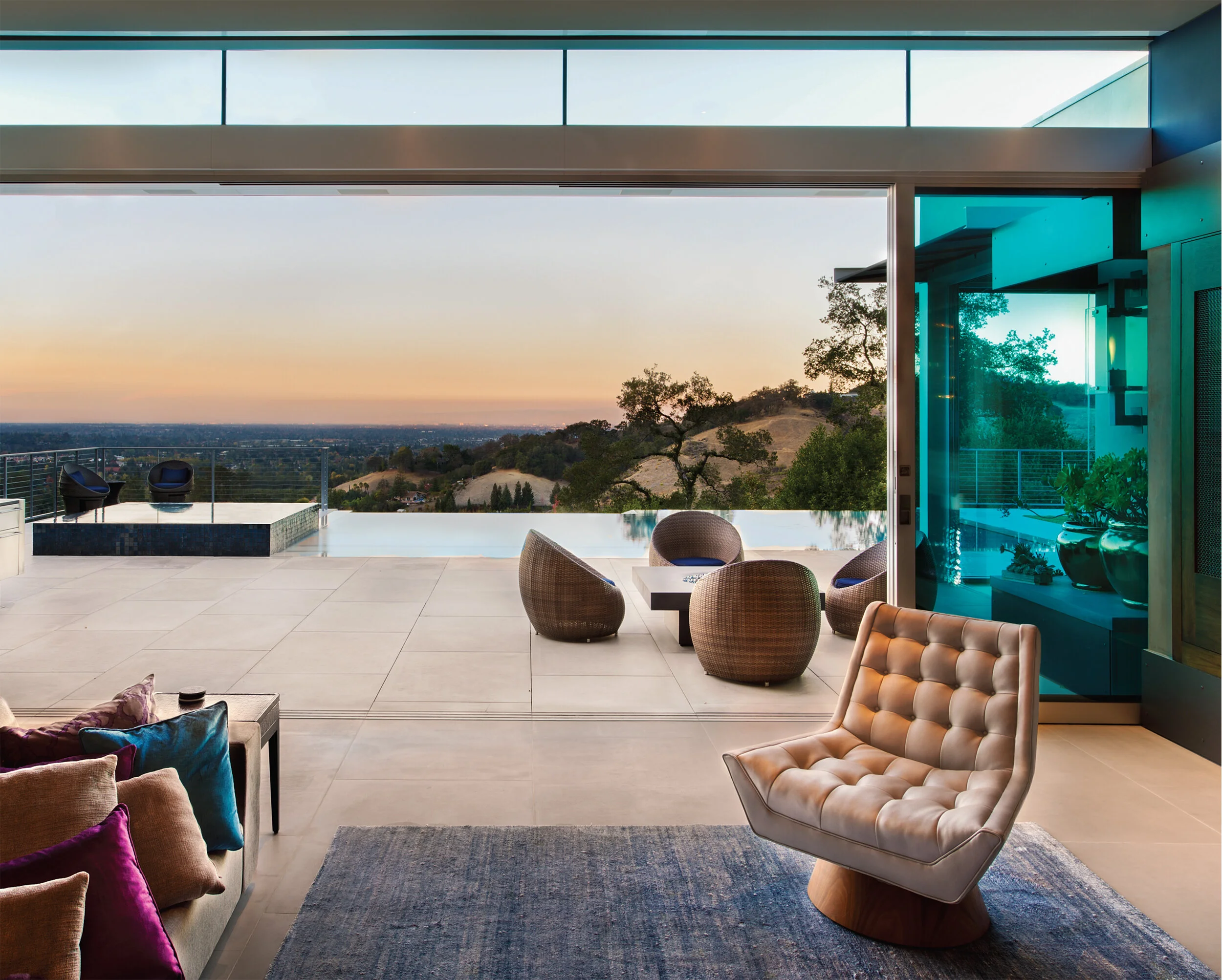 Throughout the otherwise rectilinear design of the home’s architecture, organic and curved shapes are interspersed, breaking up the strong geometric characteristics. Note the organically shaped artistic pendants lights over the kitchen peninsula, or the sculpted blocked wall with its interlocking rings which divide the great room from the hallway.